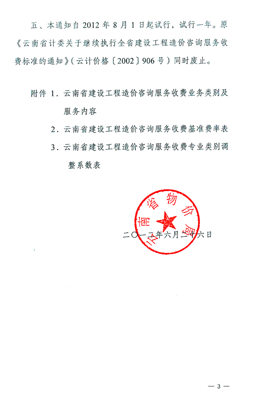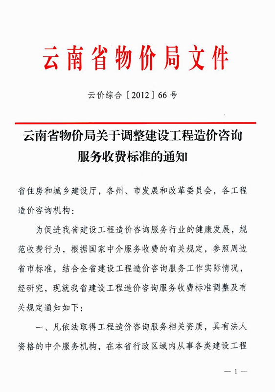 云南省物價(jià)局關(guān)于調(diào)整建設(shè)工程造價(jià)咨詢服務(wù)收費(fèi)標(biāo)準(zhǔn)的通知 云價(jià)綜合[2012]66號