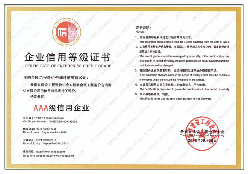 2018年9月29日,中國建設(shè)工程造價管理協(xié)會對昆明金甌工程造價咨詢評估有限公司的信用狀況進(jìn)行了評價,評定金甌公司為,并頒發(fā)了“企業(yè)信用等級AAA級信用企業(yè)”等級證書。