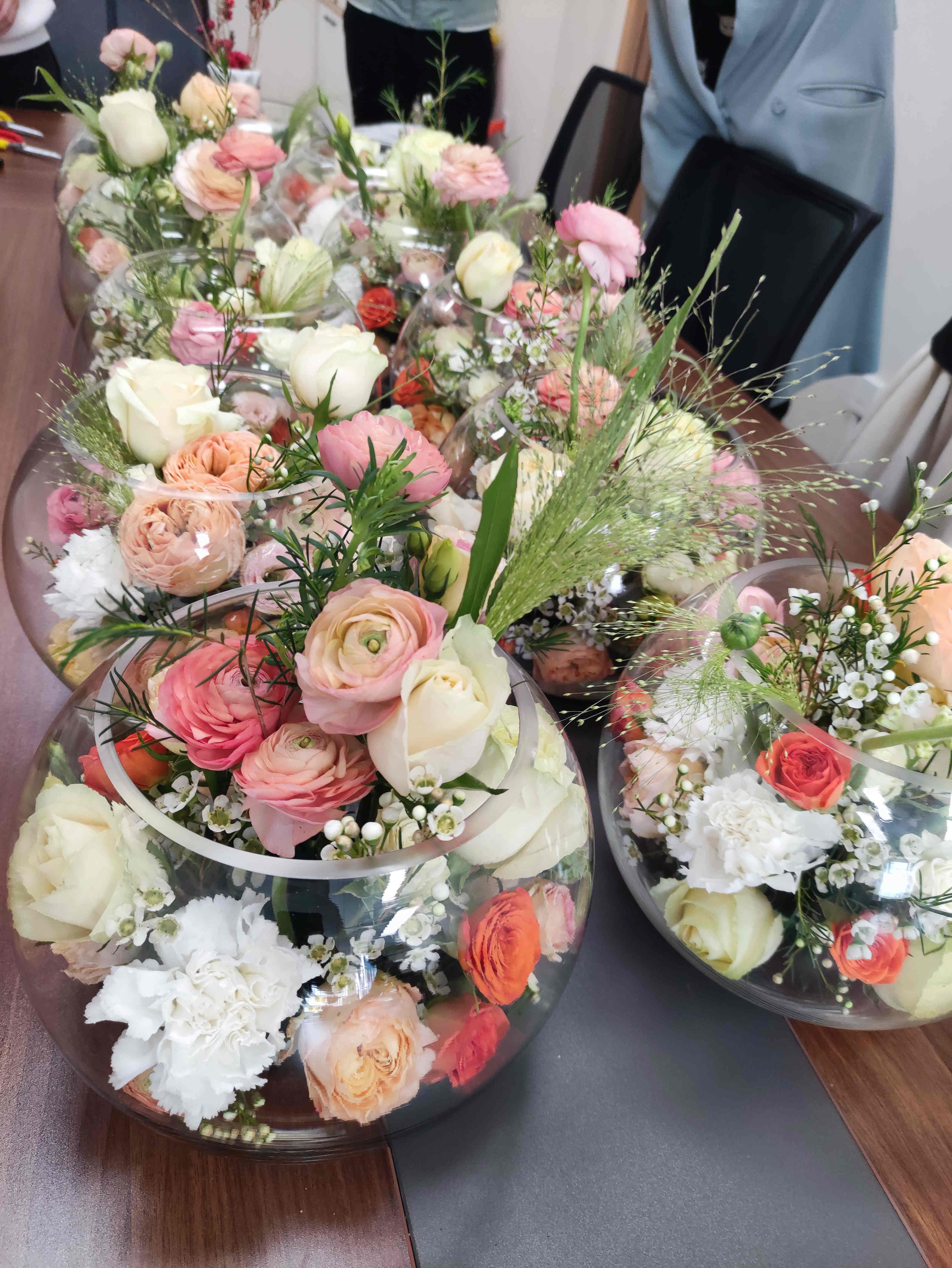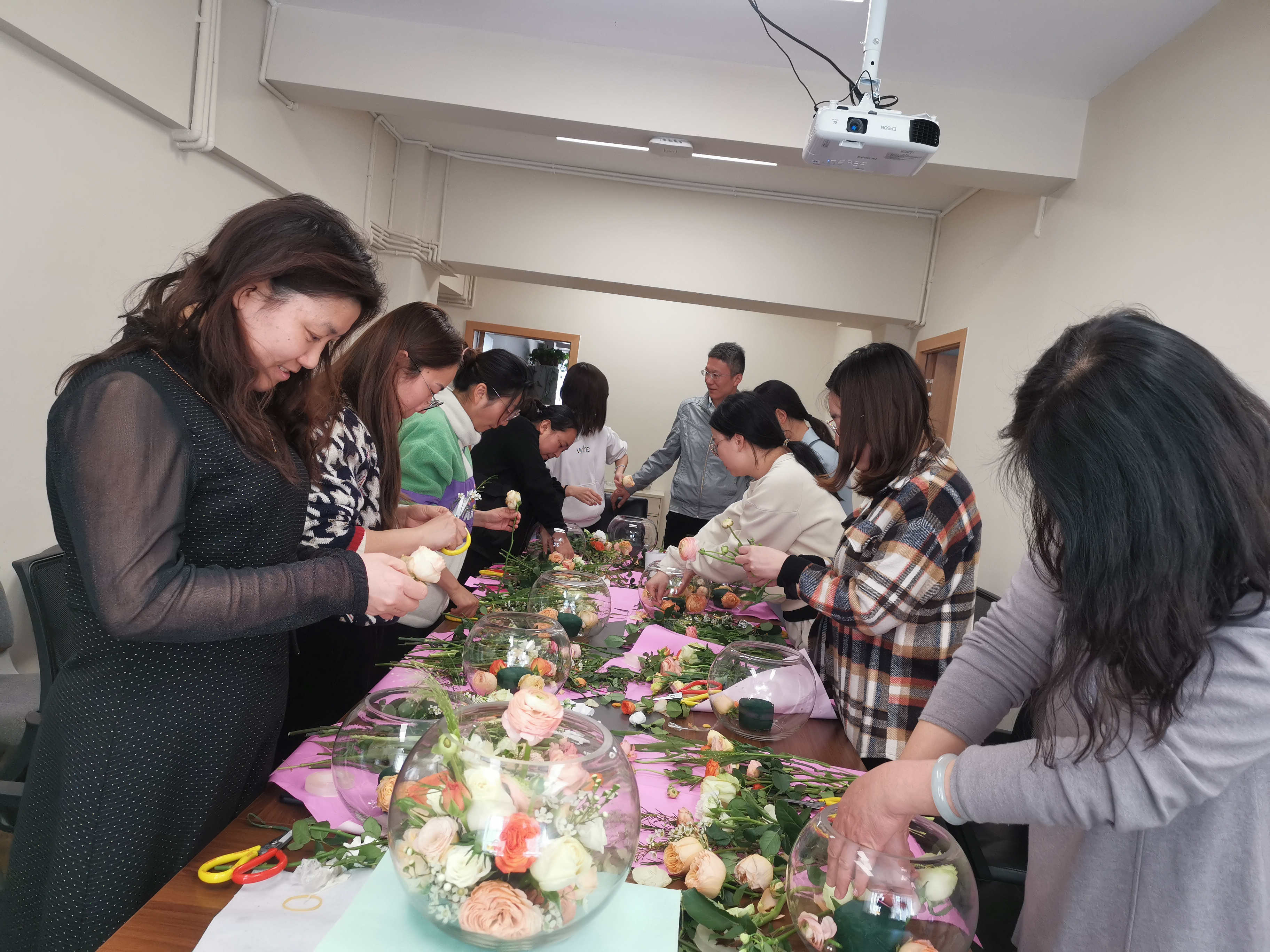 本次活動(dòng)邀請(qǐng)花店老師進(jìn)行現(xiàn)場(chǎng)授課,活動(dòng)開始,老師與女職工們互動(dòng)介紹了各種常見的花材種類,隨后為大家講述花材的特點(diǎn)以及鮮花養(yǎng)護(hù)的技巧。大家聽得津津樂道,積極發(fā)言,在老師重點(diǎn)講授插花的造型、點(diǎn)與面的結(jié)合、動(dòng)靜的分布等要點(diǎn)中,以鮮花來演示,讓女職工們直觀詳細(xì)地學(xué)習(xí)插花知識(shí)點(diǎn)。最后,在老師的耐心輔導(dǎo)下,大家的作品雛形初現(xiàn),花與花之間的搭配疏密聚散,各個(gè)作品鮮艷明麗、各具特點(diǎn),而鮮花和綠葉的搭配高低錯(cuò)落有致,別具一格。課堂氣氛輕松而愉悅,女職工們彼此欣賞作品,留影合拍。