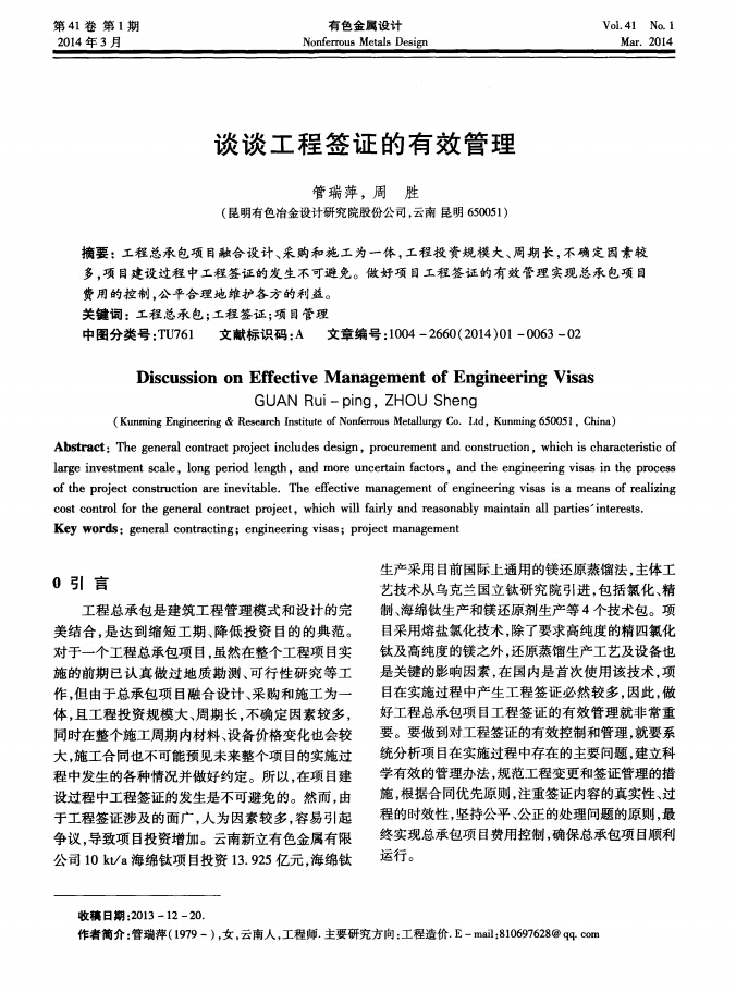 熱烈慶祝我公司工程師發(fā)表的論文《談?wù)劰こ毯炞C的有效管理》入選《有色金屬設(shè)計(jì)》雜志2014年1期,交流在工藝、技術(shù)、控制、工程簽證等方面,工程造價(jià)的有效管理和造價(jià)控制運(yùn)行經(jīng)驗(yàn),推動(dòng)行業(yè)技術(shù)進(jìn)步和持續(xù)健康發(fā)展。